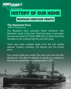 The Dame Vera Lynn named after the ‘forces sweetheart’ who grew up in East Ham. The Ben Woollacott named after the ferry’s deckhand who was the sixth generation of his family to work on the river, he passed away whilst working in 2011 and the boat was named in his honour.
