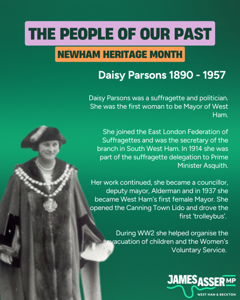 Daisy Parsons was a suffragette and politician. She was the first woman to be Mayor of West Ham.