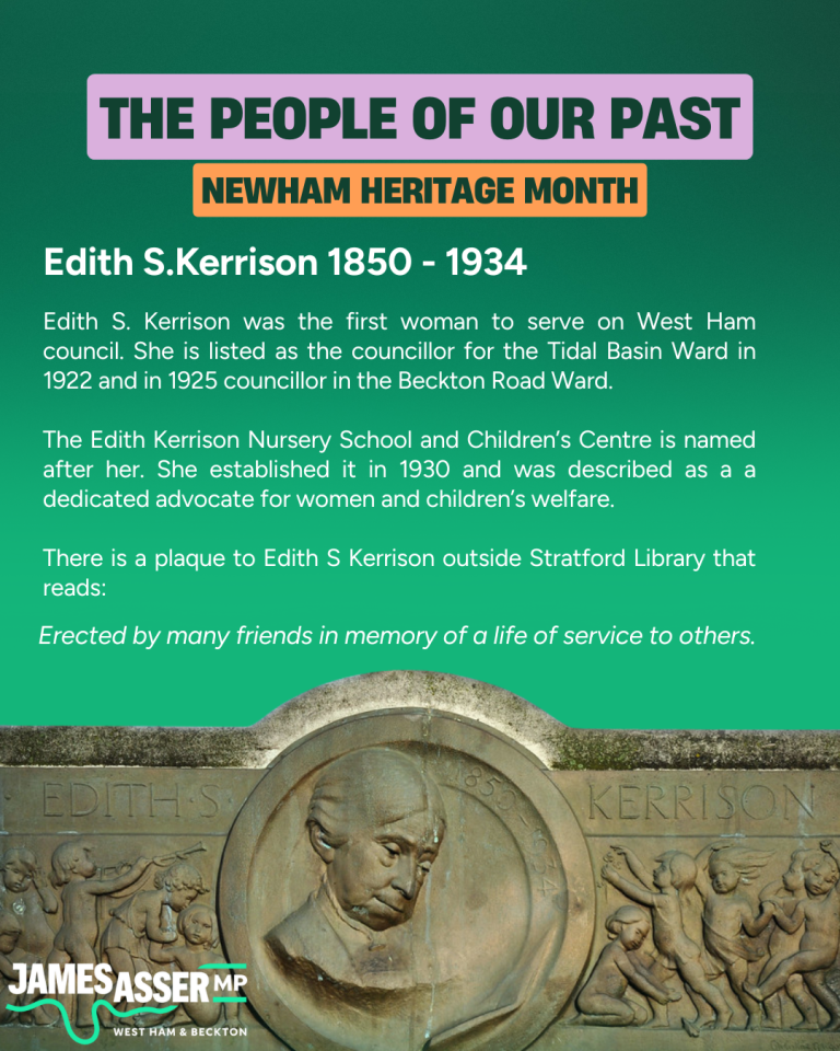 Edith Sophia Kerrison was the first woman to serve on West Ham council. She is listed as the councillor for the Tidal Basin Ward in 1922 and in 1925 councillor in the Beckton Road Ward.