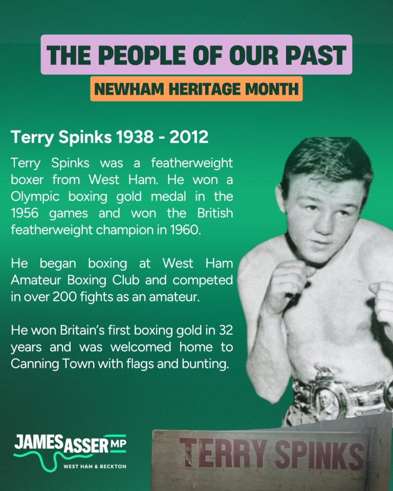 Terry Spinks was a featherweight boxer from West Ham. He won a Olympic boxing gold medal in the 1956 games and won the British featherweight champion in 1960.